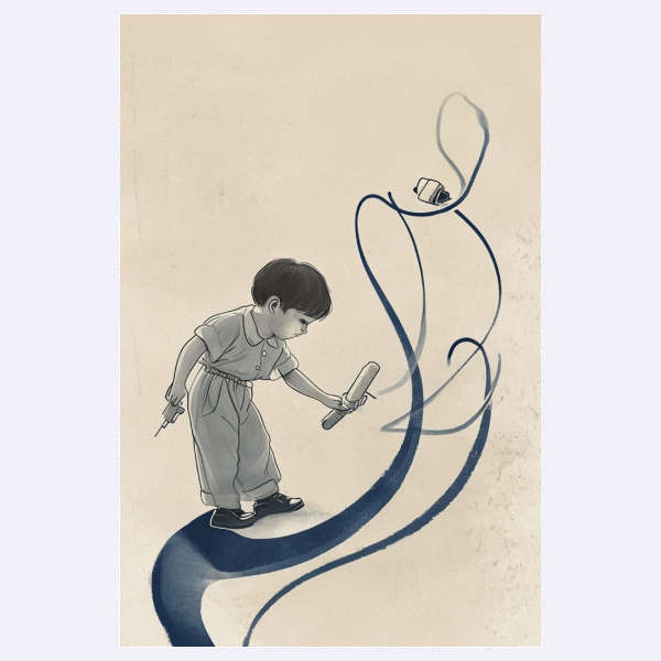 Ilustrasi imajinatif seorang anak yang menggambarkan jalan biru gelap—penuh makna eksplorasi dan mimpi masa kecil.