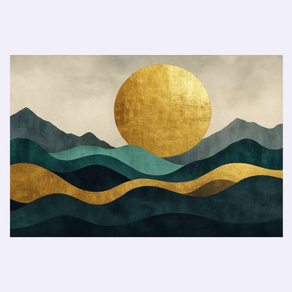 Nikmati keindahan alam dalam balutan warna keemasan. Lukisan ini menggambarkan matahari terbenam yang hangat di atas perbukitan bertekstur, menciptakan suasana tenang dan elegan. Cocok untuk mempercantik ruang tamu, kamar tidur, atau sudut santai favorit Anda.