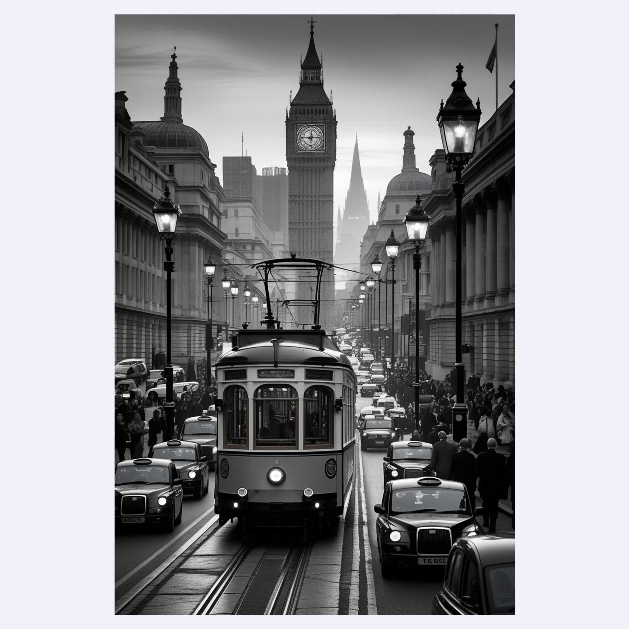 Poster kota London dengan nuansa monokrom yang elegan. Cocok untuk dekorasi bergaya urban dan modern, menambah kesan metropolitan pada ruangan Anda.