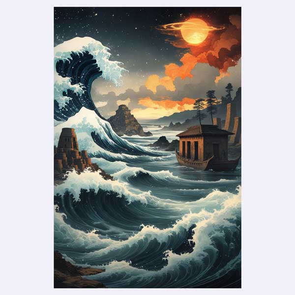 Kekuatan alam dan keindahan surgawi berpadu dalam “Waves of Revelation”. Lukisan ini menggambarkan gelombang laut yang menggulung dahsyat di bawah langit senja yang magis, lengkap dengan matahari merah menyala dan awan dramatis. Sentuhan gaya Jepang klasik dan nuansa fantasi membuat karya ini menciptakan atmosfer mendalam dan penuh makna. Cocok untuk Anda yang mencari wall art penuh cerita dan emosi visual.